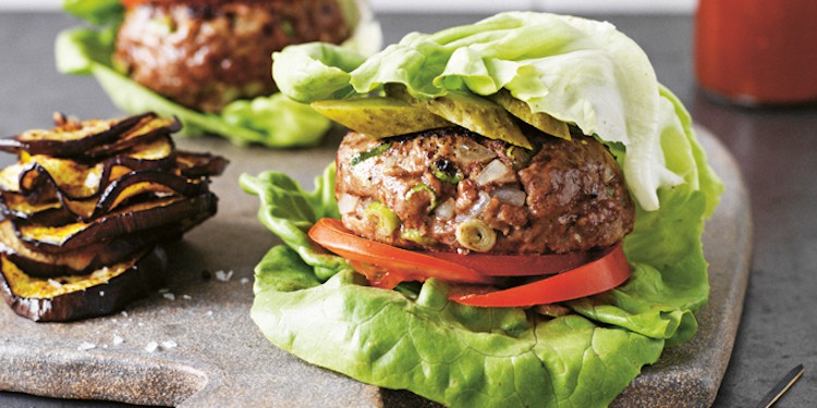 Verwarm in een grote koekenpan een el olijfolie en bak de hamburgers boven een middelhoog vuur 4 tot 5 minuten per kant. Pak na het bakken vier borden en plaats op elk bord een groot blad sla. Haal de hamburgers uit de pan en plaats op de sla bladeren. Garneer de hamburgers eventueel met plakjes tomaat, augurk en saus. Bedek tenslotte de hamburgers met een blad sla en genieten maar!